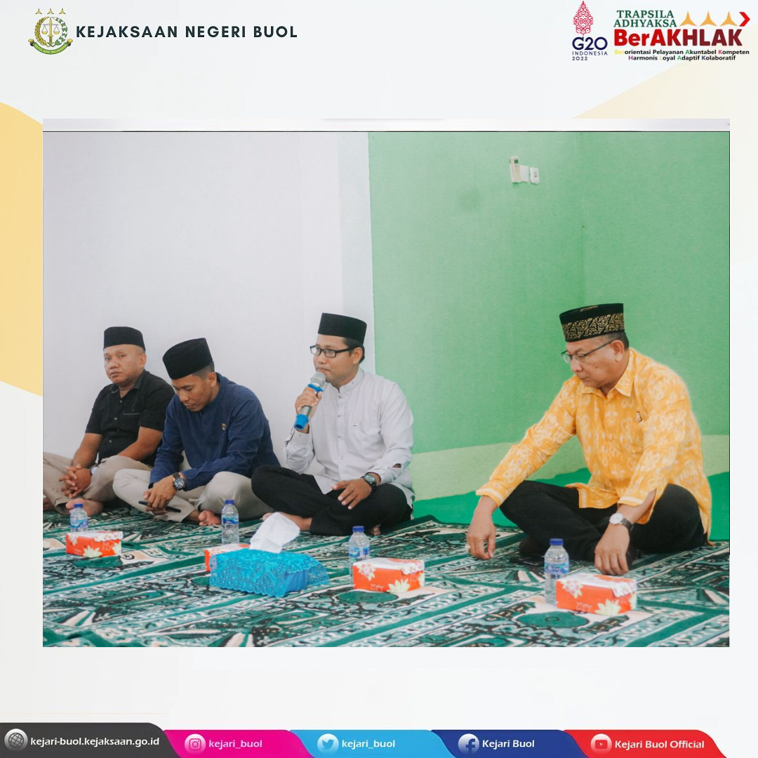 Jumat, 24 Juni 2022 bertempat di Masjid Al-Mizan Kantor Kejaksaan Negeri Buol, Sub Bagian Pembinaan Kejaksan Negeri Buol mengadakan Bimbingan Rohani bagi Seluruh Pegawai Kejaksaan Negeri Buol yang beragama islam dihadiri oleh Kepala Kejaksaan Negeri Buol Bpk. Lufti Akbar, S.H., M.H. beserta para Kasi dan Staff. Dalam penyampainya Ustadz Mahmud menyampaikan Manusia Berada dalam Kerugian waktu, Maka dari itu kita harus menjadi Manusia yang Mulia dengan cara 1.Beriman 2.Berilmu 3.Bersabar 4.Menolong sesama manusia