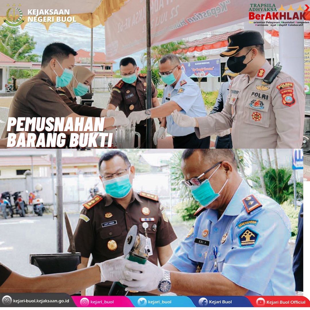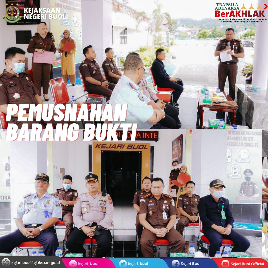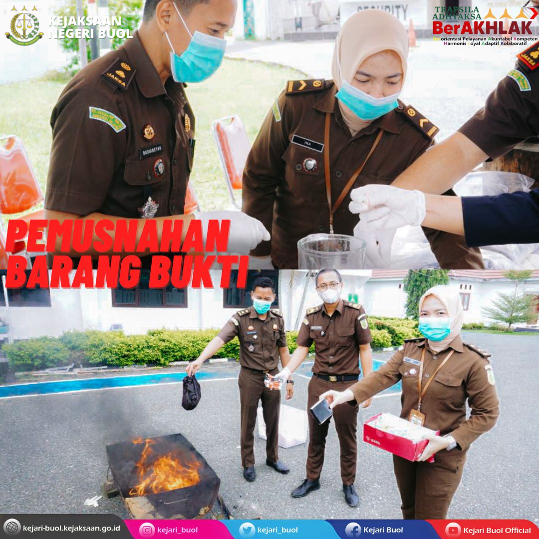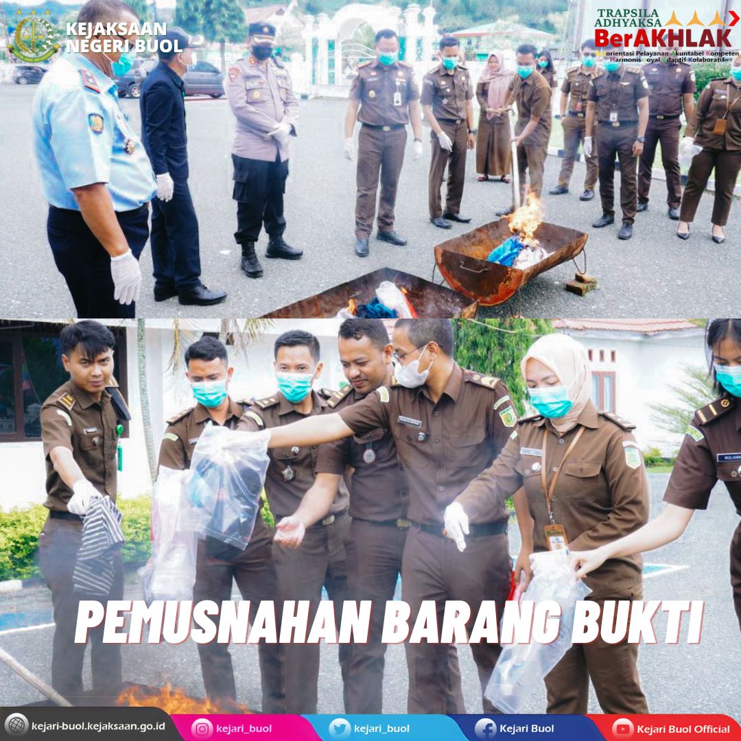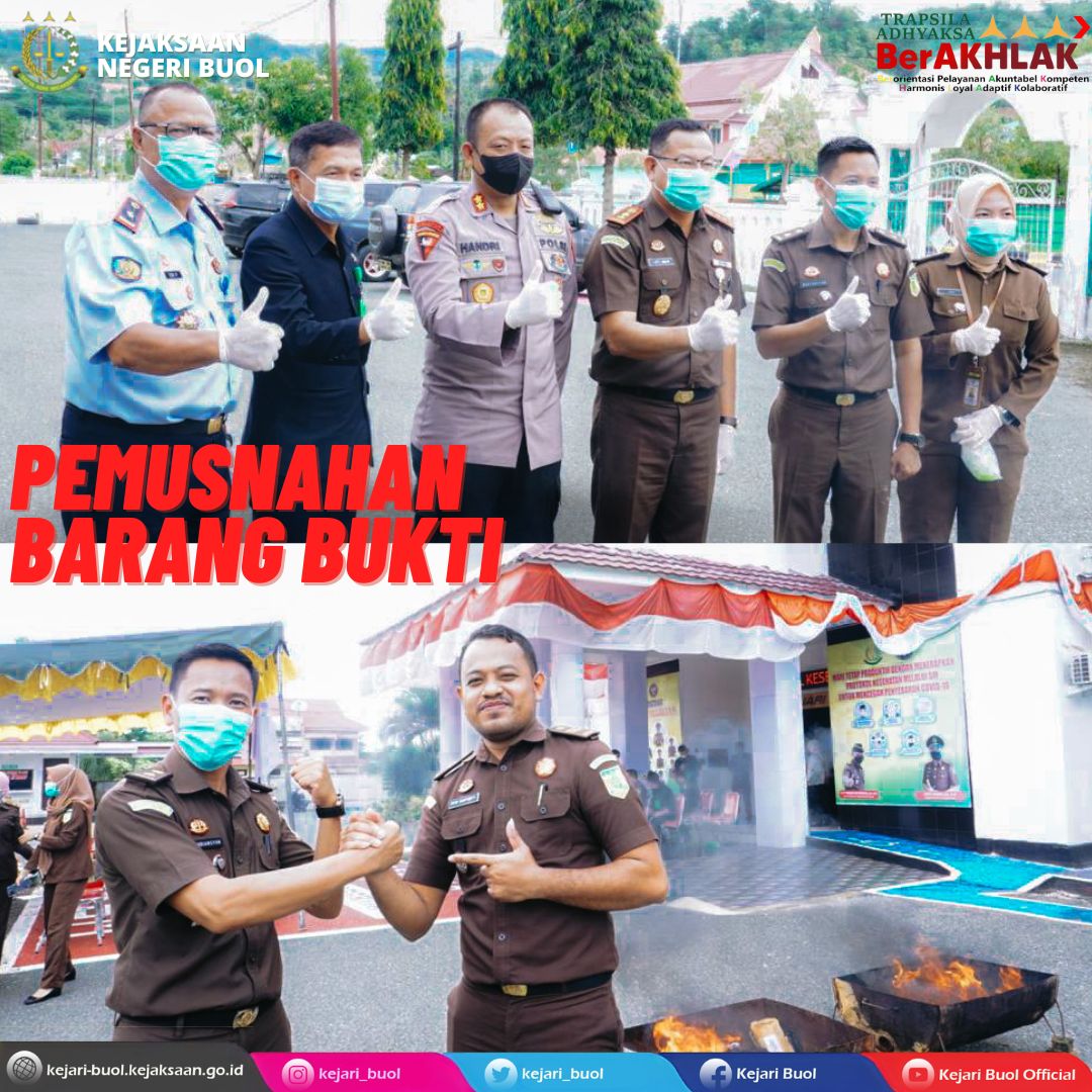 Kepala Seksi Barang Bukti dan Barang Rampasan Kejaksaan Negeri Buol melakukan Pemusnahan Barang Bukti terhadap Barang Bukti yang diputus untuk dimusnahkan dalam putusannya yang telah Inkracht. Acara pemusnahan Barang Bukti berlangsung di Halaman Kantor Kejaksaan Negeri Buol yang dihadiri oleh Kepala Kejaksaan Negeri Buol, Ketua Pengadilan Negeri Buol, Kepala Kepolisian Resor Buol, Kepala Lapas Kelas III Leok, Kepala Seksi Intelijen, Kepala Seksi Tindak Pidana Umum, Para Jaksa, serta Pegawai Kejaksaan Negeri Buol.