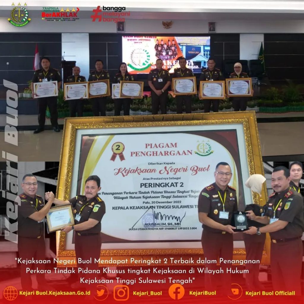 Kejaksaan Negeri Buol mendapat peringkat ke-2 Atas prestasi penanganan Perkara Tindak Pidana Khusus dan peringkat ke 3 pada penilaian bidang pengawasan dalam optimalisasi kualitas program kerja pengawasan, review keuangan dan zero Lapdu tahun 2022 tingkat Kejaksaan se-Wilayah Hukum Kejaksaan Tinggi Sulawesi Tengah.