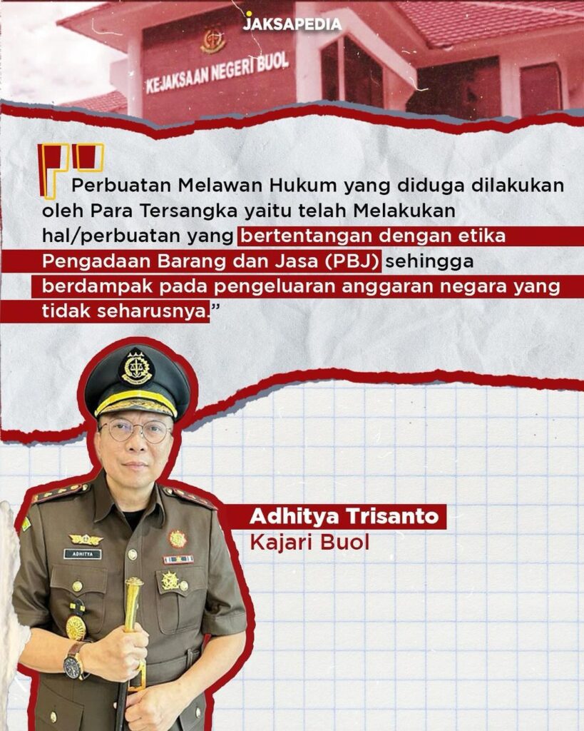 Penyidik Tindak Pidana Korupsi Kejaksaan Negeri Buol pun menyelidiki kasus ini dan menetapkan 3 (tiga) orang Tersangka dalam Perkara dugaan Tindak Pidana Korupsi Pekerjaan Pembangunan Saluran Pengendali Banjir Dan Pedestrian Jl Batalipu Kabupaten Buol Tahun Anggaran 2019, pada kamis 11 juli 2024