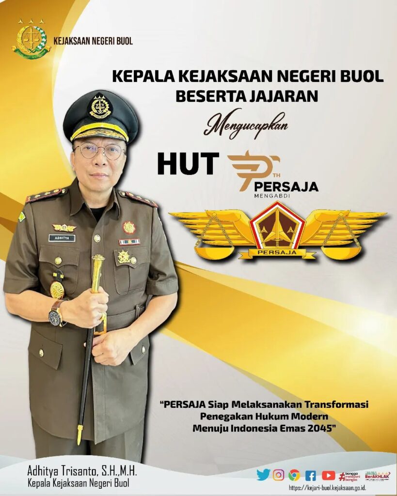 Kepala Kejaksaan Negeri Buol Bapak Adhitya Trisanto, S.H., M.H beserta jajaran mengucapkan selamat HUT PERSAJA ke 73 Tahun 2024 “PERSAJA Siap Melaksanakan Transformasi Hukum Modern Menuju Indonesia Emas 2045″