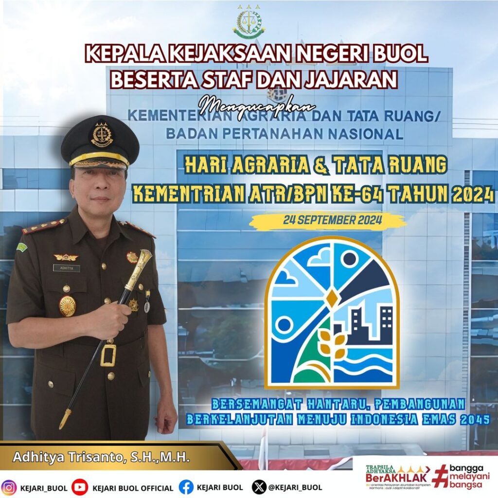 Kepala Kejaksaan Negeri Buol beserta seluruh jajaran mengucapkan Selamat Memperingati Hari Agraria dan Tata Ruang Nasional (HANTARU), 24 September 2024.