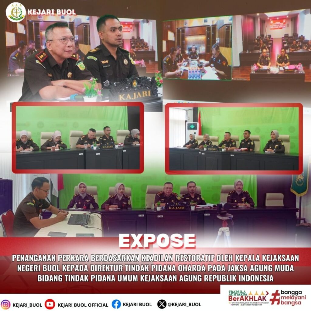 Bahwa pada hari Rabu tanggal 14 Agustus 2024 telah dilaksanakan kembali ekspose penanganan perkara berdasarkan keadilan restoratif di Kejaksaan Negeri Buol secara virtual oleh Kepala Kejaksaan Negeri Buol kepada Direktur Tindak Pidana Oharda pada Jaksa Agung Muda Bidang Tindak Pidana Umum Kejaksaan Agung Republik Indonesia