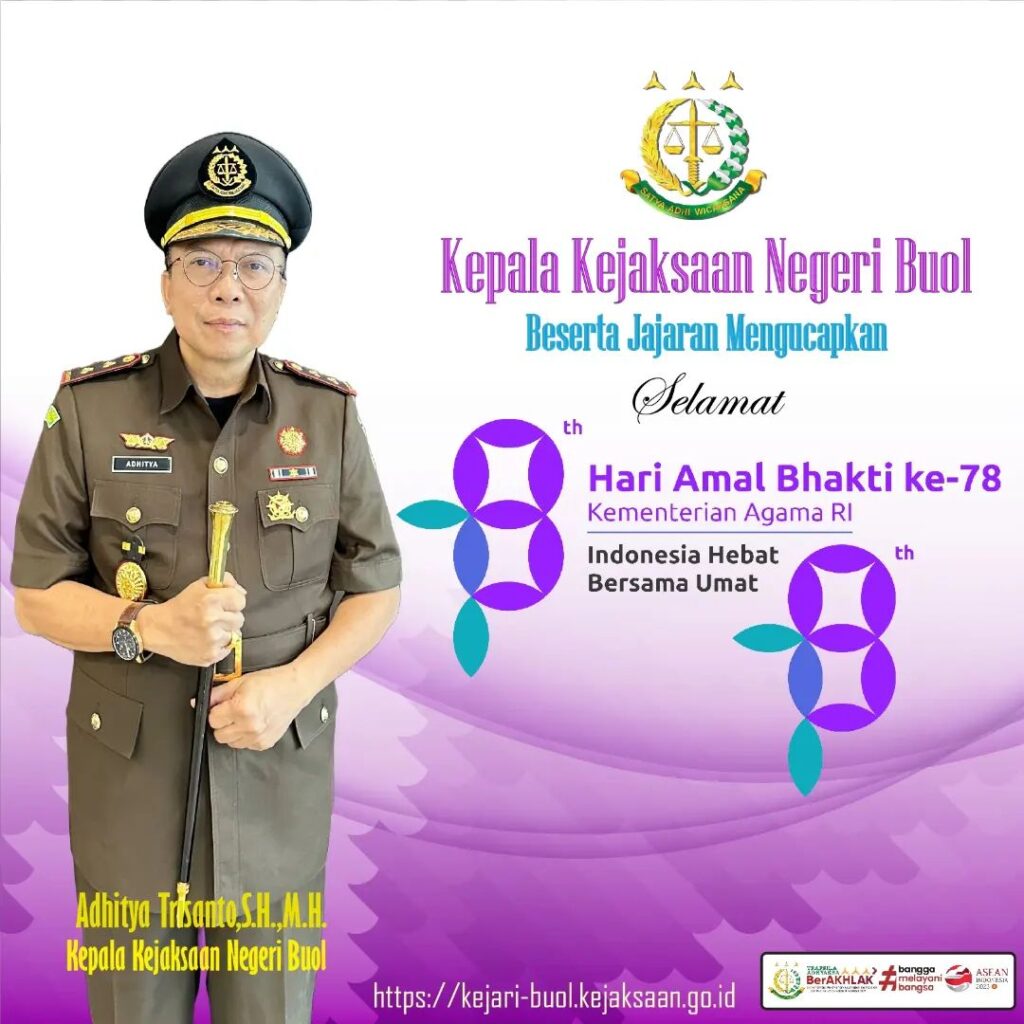 Kepala Kejaksaan Negeri Buol Bapak Adhitya Trisanto,S.H.,M.H, beserta jajaran mengucapkan selamat Hari Amal Bhakti ke-78 Kementerian Agama RI “Indonesia Hebat Bersama Umat”.