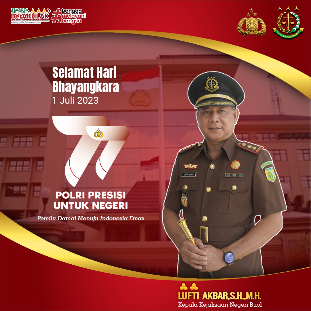 Kepala Kejaksaan Negeri Buol, Lufti Akbar,S.H.,M.H. beserta Jajaran mengucapkan Selamat Hari Bhayangkara Ke-77, Polri Presisi Untuk Negeri “Pemilu Damai Menuju Indonesia Emas”.
