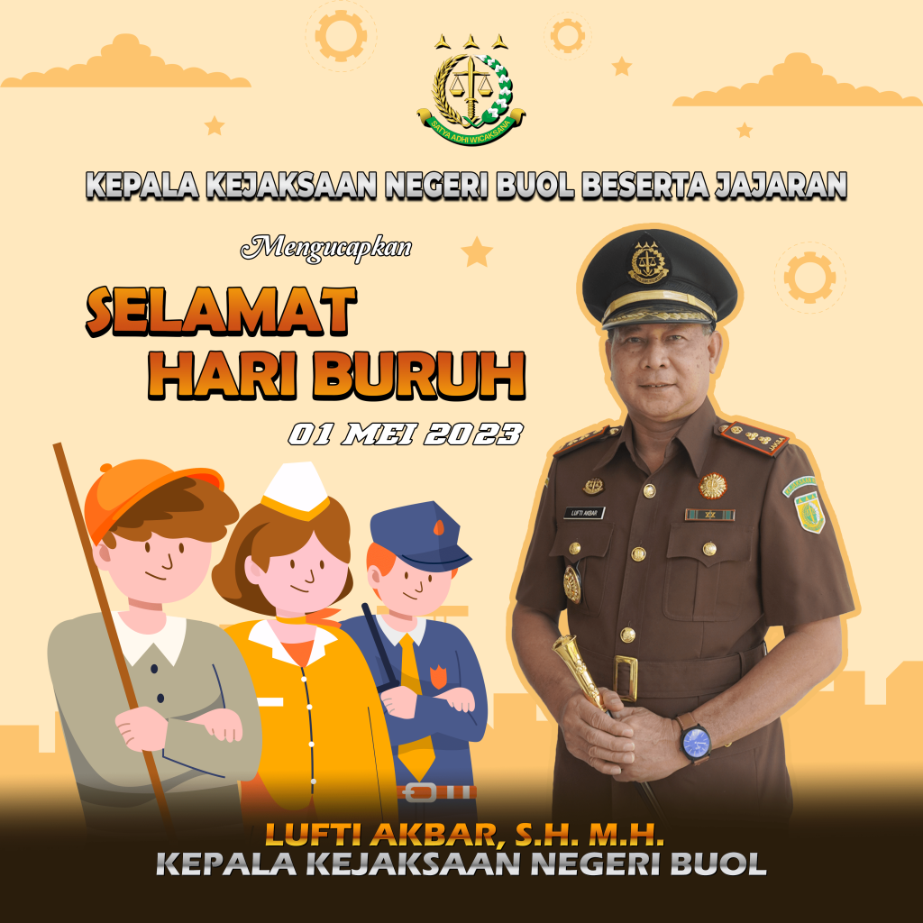 Kepala Kejaksaan Negeri Buol beserta Jajaran mengucapkan Selamat Hari Buruh Nasional 1 Mei 2023! Terima kasih untuk seluruh pekerja dan buruh di Indonesia atas semangat dan kerja keras demi kemajuan bangsa.