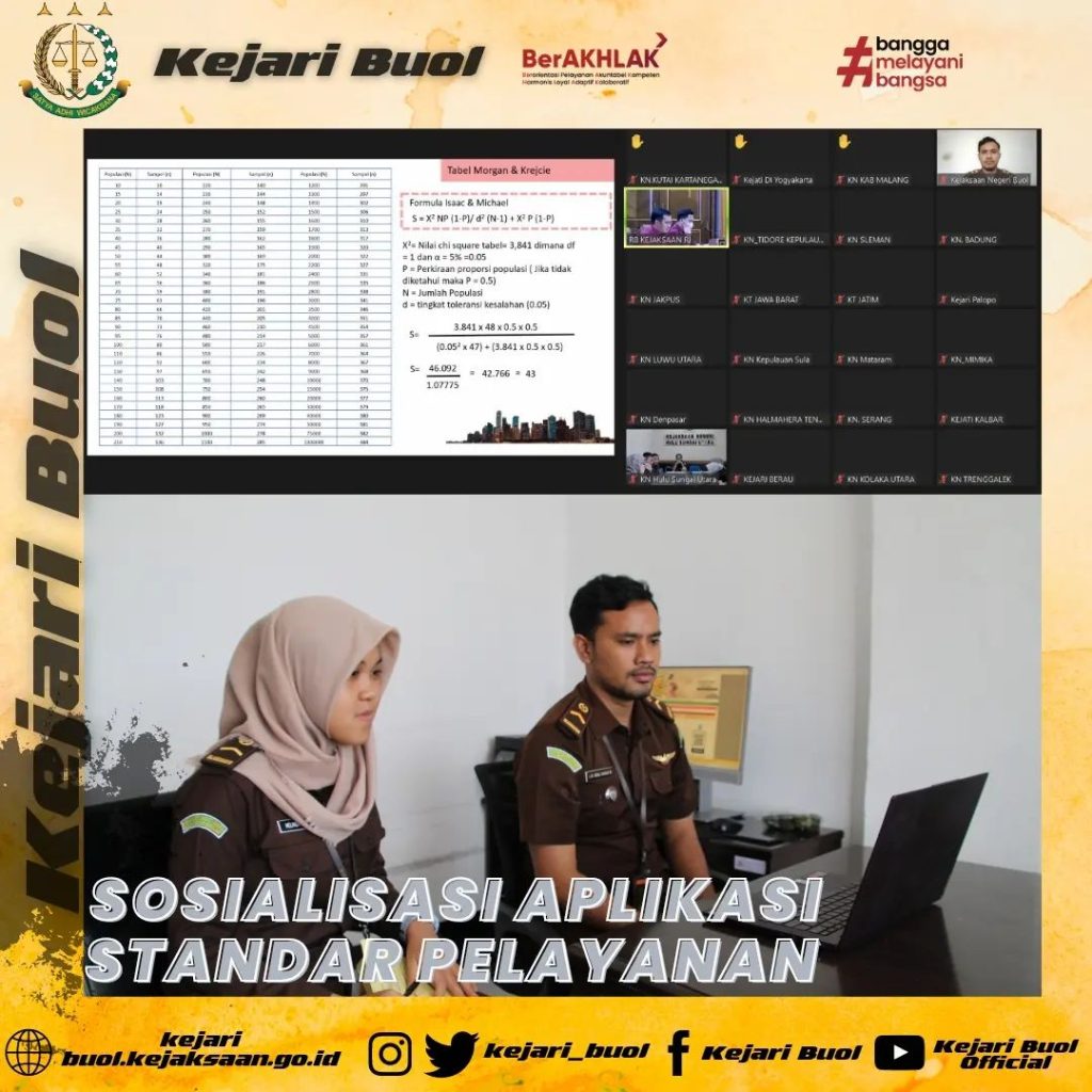 Bidang pembinaan pada Kejaksaan Negeri Buol mengikuti kegiatan Sosialisasi Standar Pelayanan pada Instansi Pemerintah secara virtual yang dilaksanakan oleh Kementerian Pendayagunaan Aparatur Negara dan Reformasi Birokrasi.