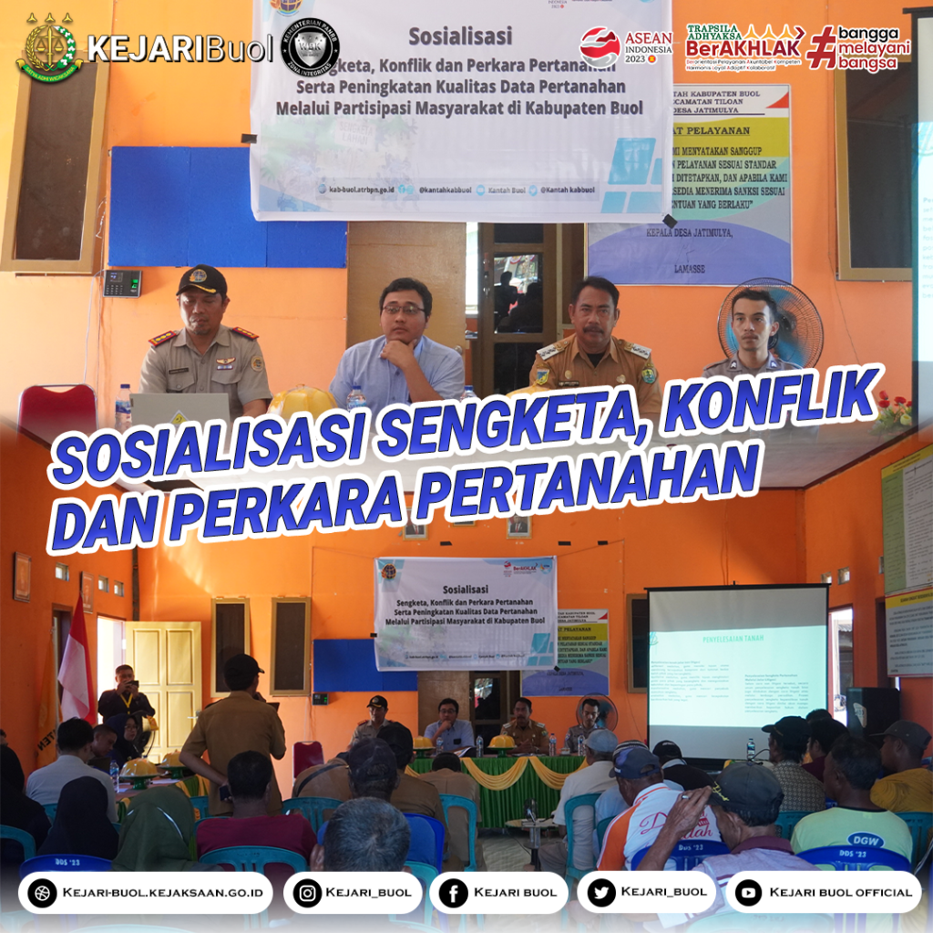 Plh. Kepala Kejaksaan Negeri Buol Bapak Dimas Putra Pradhyksa, S.H.,M.H, menjadi narasumber pada kegiatan sosialisasi sengketa, konflik dan perkara pertanahan yang dilaksanakan di Desa Jati Mulya Kecamatan Tiloan Kabupaten Buol oleh Badan Pertanahan Nasional Kabupaten Buol.