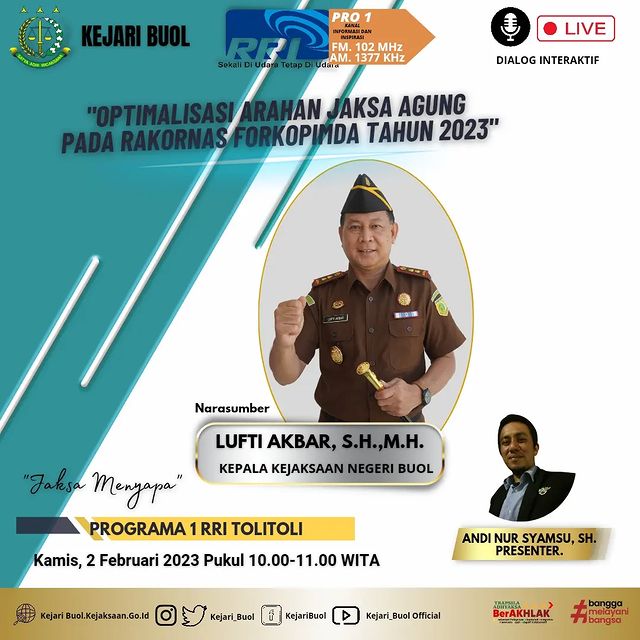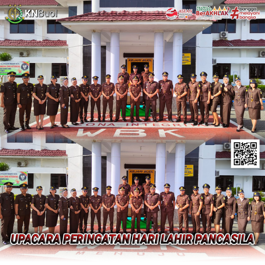 Bertempat di Halaman Kantor Kejaksaan Negeri Buol, Pegawai pada Kejaksaan Negeri Buol dan Cabang Kejaksaan Negeri Buol di Lokodidi melaksanakan Upacara Peringatan Hari Lahir Pancasila, bertindak sebagai Inspektur Upacara yaitu Kepala Cabang Kejaksaan Negeri Buol di Lokodidi Bapak Jeffry G. Lokopessy, S. H., M.H.